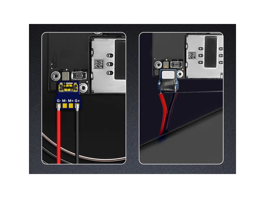 Řešení problému spouštění bez baterie: Díky přesné definici pinů podle originálních baterií umožňuje tento nástroj zapnout telefon a provést základní diagnostiku, testování displeje, kamery a dalších komponent i bez připojené baterie.