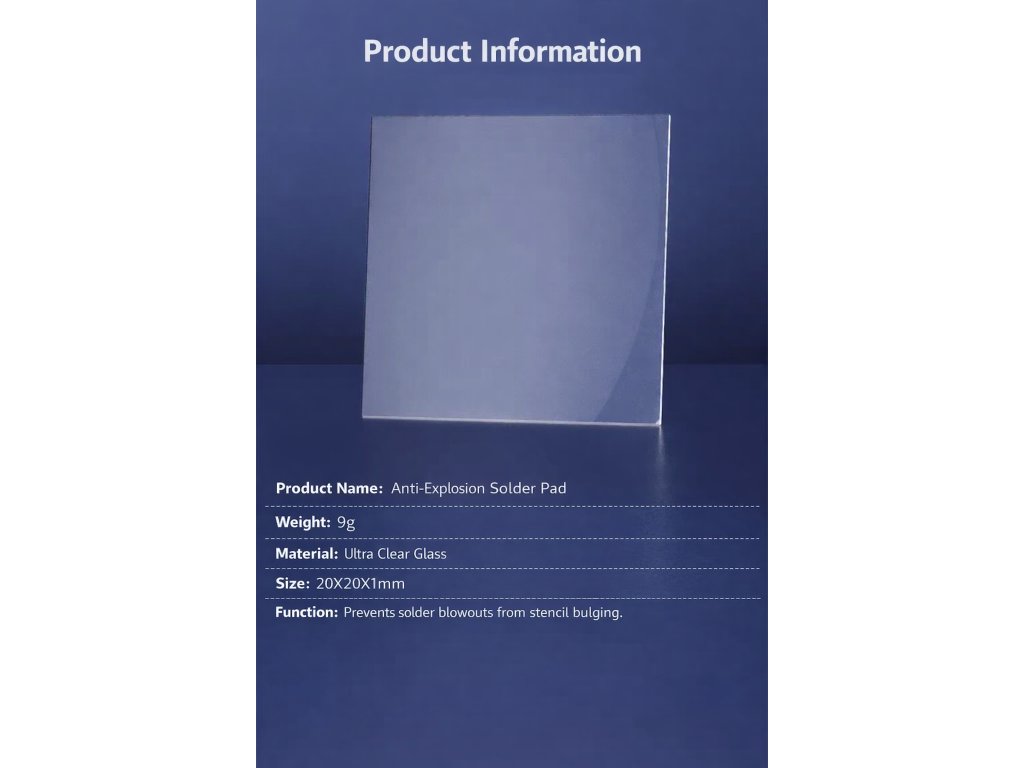 Podložka z super bílého skla o rozměrech 20 x 20 x 1 mm se umístí pod desku s plošnými spoji (PCB), přímo pod oblast, kde probíhá cínování pomocí šablony. Její dokonale rovný a tepelně odolný povrch, spolu s konstrukcí (často v kombinaci s hliníkovou základní podložkou – „bottom aluminum pad“), vytváří rovnoměrný a pevný podpůrný bod. Tím zabraňuje vydutí („drumming“) ocelové šablony během procesu zahřívání.