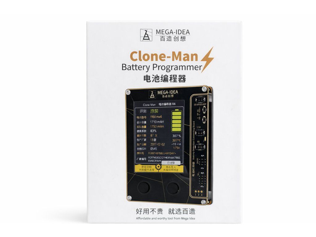 MEGA-IDEA Clone-Man Battery Programmer je specializovaný servisní nástroj určený pro práci s bateriemi iPhone. Umožňuje kopírování a přenos dat z originální baterie na novou, čímž zachovává důležité informace jako sériové číslo nebo stav baterie.