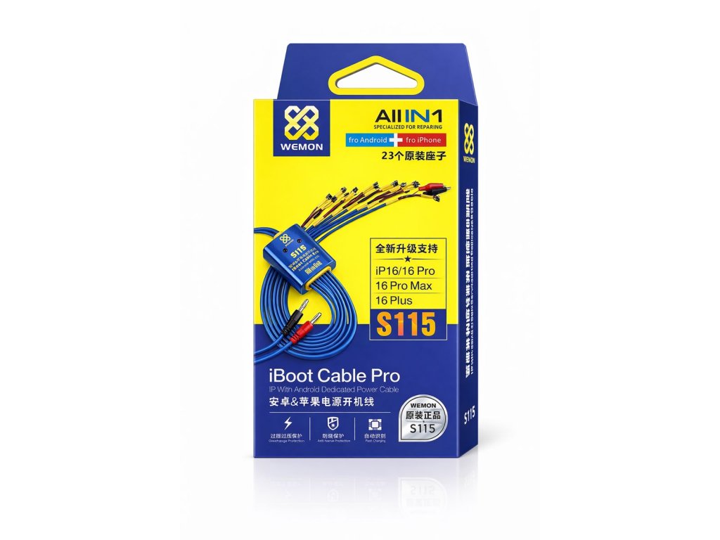 WEMON S115 iBoot Cable Pro je profesionální servisní napájecí kabel typu All-in-One, určený pro opravy a diagnostiku iPhone i Android zařízení. Umožňuje bezpečné zapnutí telefonu bez baterie nebo při servisních zásazích, jako je výměna displeje, konektoru, základní desky či testování zařízení.